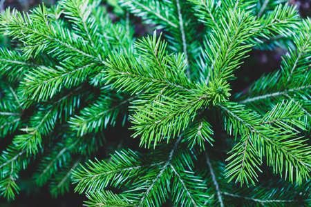 Texture of young green christmas needles on a dark background. Natural wallpaper.