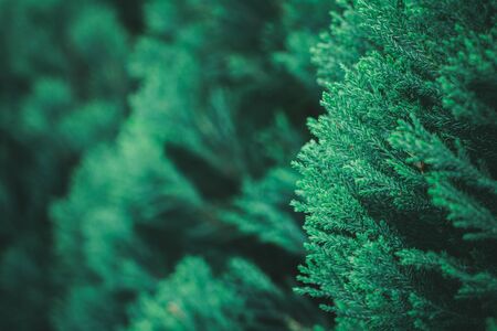 Green dark toned image of coniferous tree branches - ideal for trendy natural background decoration ( cinematic color grading)