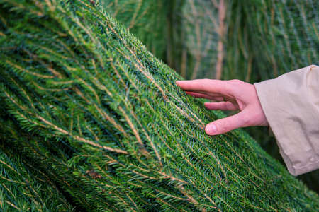 Christmas atmosphere. Green Christmas tree, coniferous tree. Blue, cold shade of needles.