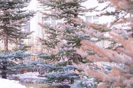 Branches of blue spruce reddened from adverse conditions, unsuccessful transplantation or illness, selective focus