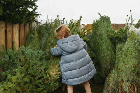 Small girl chooses a Christmas tree in the market.
