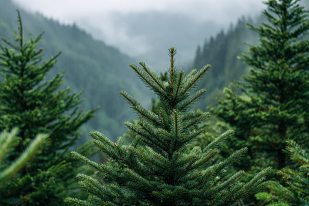 Close-up image of lush evergreen branches. The serene green hues and details intricately celebrate the beauty of winter nature.