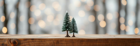 Miniature toy Christmas trees on a wooden table with snow. Imitation realistic scene