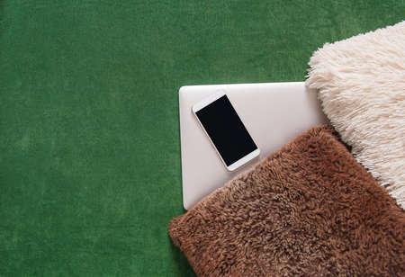 Top view with laptop, smartphone and pillows on sofa fabric background. Mock up for design