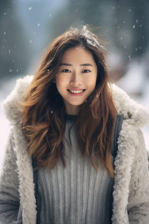 Young Asian woman in a warm scarf and coat surrounded by falling snowflakes, creating a peaceful winter scene perfect for seasonal themes, lifestyle promotions, or festive content