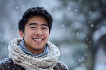 Smiling young Asian man wearing warm layers and a scarf outdoors on a snowy winter day, radiating happiness and warmth in a serene seasonal setting