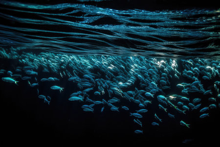 schools of fish swimming through the dark depths with their scales and fins twinkling, created with generative ai