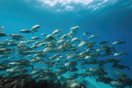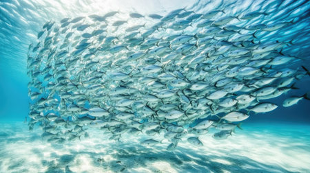 An underwater dance of light and shadows as a sweeping school of silver fish glide through the tranquil blue ocean. Generative AI
