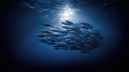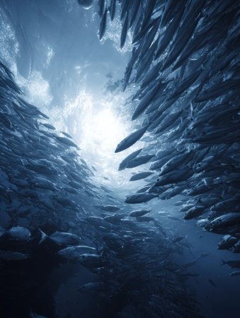 From the deep blue depths, a massive school of fish moves as one organism. They swim in perfect unison towards the life-giving sunlight piercing the oceans surface, a breathtaking display of natural teamwork and survival.