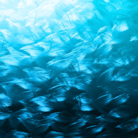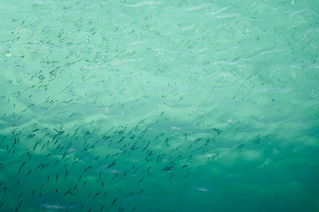 Millions of little fish under the sea water surface that reflects sunlight.