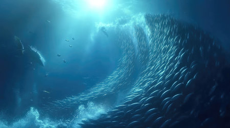 A breathtaking underwater scene showcasing a school of fish forming a stunning wave pattern under shimmering sunlight, creating a serene marine environment.