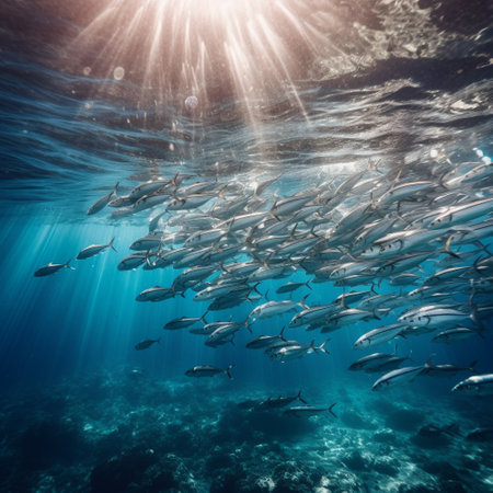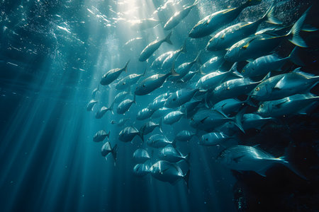 A captivating underwater scene featuring a school of fish swimming gracefully in clear blue water. Sunlight beams filter through the surface, illuminating the marine environment, creating a serene and tranquil atmosphere. This image captures the beauty and diversity of ocean life, highlighting the interplay between light and water.