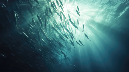 A vibrant underwater scene shows a dense school of fish moving harmoniously through the ocean, illuminated by sunlight above, creating a serene atmosphere.