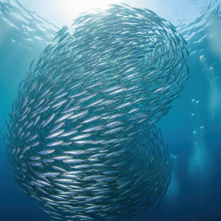 A school of shimmering sardines moving in perfect harmony, creating a mesmerizing dance of light and motion under the sea.