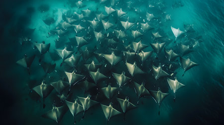 A mesmerizing underwater scene showcasing a large school of manta rays gracefully gliding through the turquoise ocean waters.