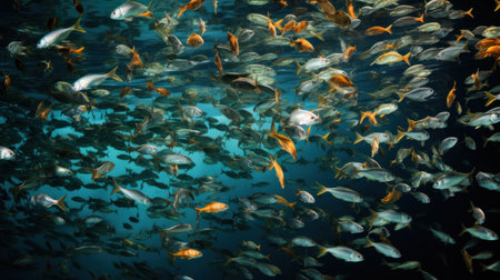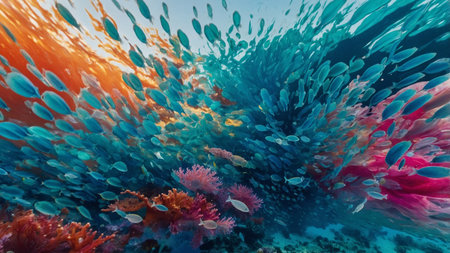 Vibrant aquatic scene featuring a swarm of fish, capturing the dynamic movement and marine life.