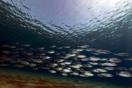 lot of bigmouth mackerels swimming past below during snorkeling in egypt