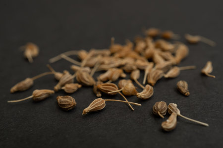 Cumin seeds on a dark background as detailed close-up shot; selective focus