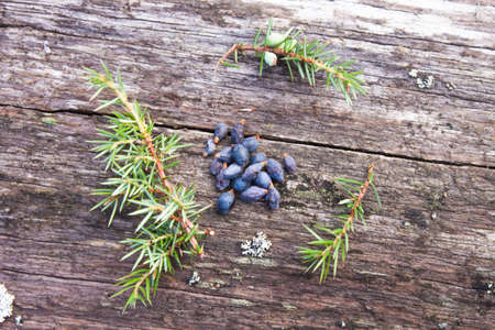 Juniperus berries, near green juniper branches, on wooden background