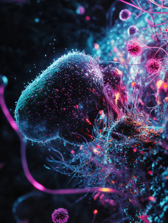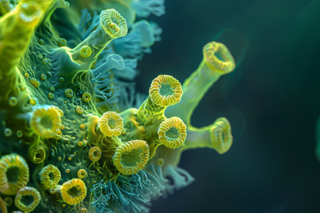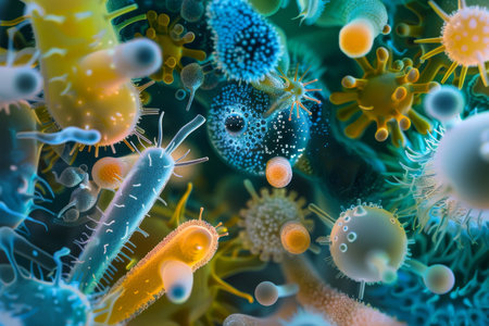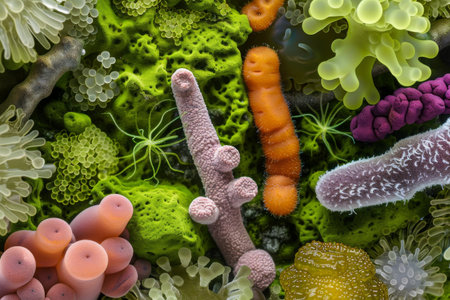 Microscopic view shows vibrant microorganisms with fascinating details and textures.