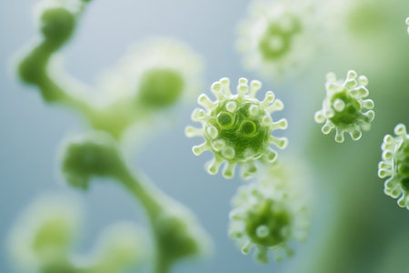 Close-up view of green viruses floating in a dark, blurred background