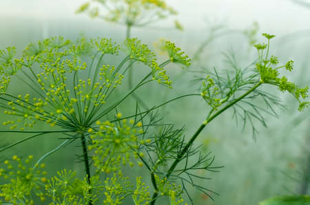 Fresh dill plant green yellow flower in the garden