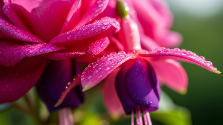 Macro shot of vibrant pink and purple fuchsia flowers adorned with numerous small dew drops on their petals.