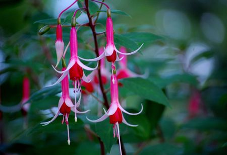 Delicate fuchsia blooms dangle gracefully among lush green leaves in a tranquil garden.