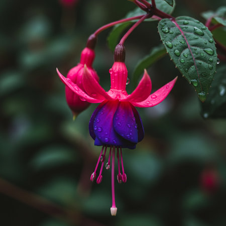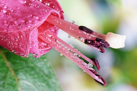 Closeup of pink fuchsia flower with water drops after rain