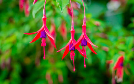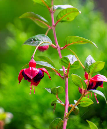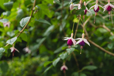 Fuchsia magellanica flower on blurred green background. Purple tropical flower in spring garden