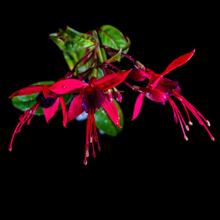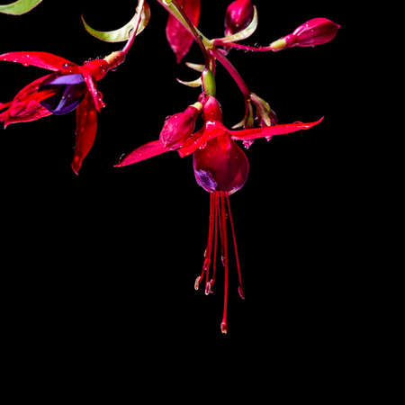 Beautiful pink fuchsia flowers with raindrops on black background