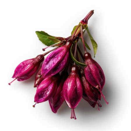 A stunning close-up of fuchsia flower buds in rich purple tones, complemented by fresh green leaves. Ideal for nature and floral concepts in design and media.