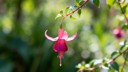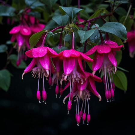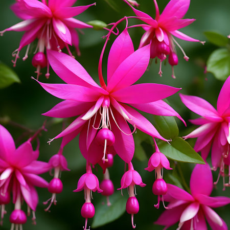 fuchsia flowers bloom vibrantly in the garden, showcasing their delicate, drooping stems and four-petaled blossoms in a stunning display of pinkish-purple hues, attracting hummingbirds and butterflies to their sweet, nectar-rich centers, adding a pop of color to any outdoor space or floral arrangement. ai generated