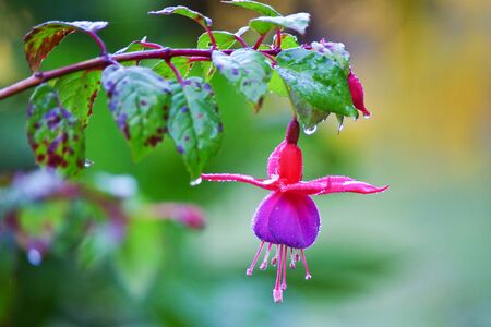 Fuchsia flower with rain drops in the garden, Thailand.