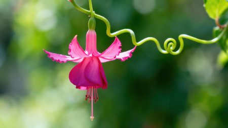 Detailed of a fuchsia flower, a rich vibrant pink color, suspended in mid-air, supported by twisting green vines, captures a sense of beauty and tranquility against a soft blurred background of...