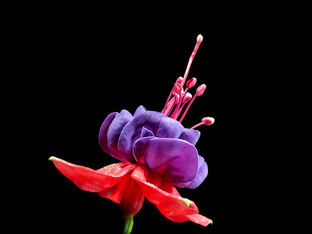 Fuchsia flower on a black background. The colors of purple and magenta. Beautiful petals pink stamen