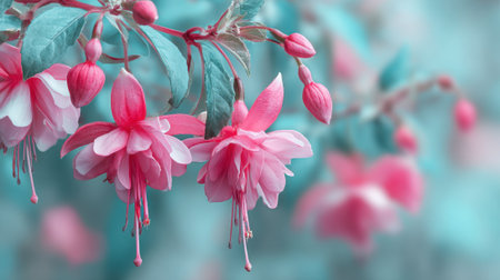 A captivating close-up reveals the intricate beauty of pink-purple fuchsia flowers. The delicate petals showcase vibrant hues, with soft textures and exquisite detail. This botanical image highlights the natural elegance of a garden favorite, perfect for themes of nature, beauty, and growth