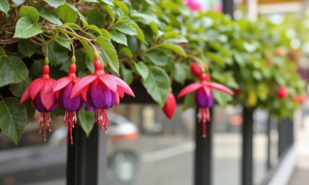 Fuchsia (Fuchsia spp.) Hanging plant with tubular, pendulous flowers in vibrant pink, purple, or red, ideal for baskets or pots,