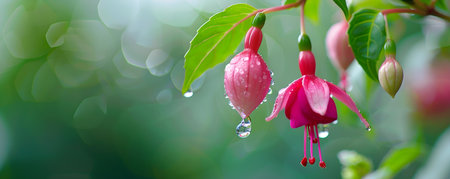 blossoms of pink fuchsia with drops after rainfall