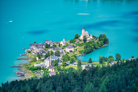 A view of the shoreline landscape and churches of Maria Wörth on Lake Woerthersee in Austria.