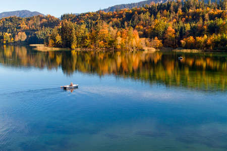 Wooden hut with boats on the lake in the autumn forest in the morning in Alps
