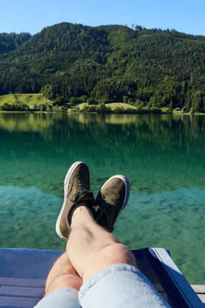 The legs of a man sitting on a deckchair, on the shore of a lake