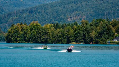 WORTHERSEE, AUSTRIA - AUGUST 08, 2018: View from the boat to the lake and coastline. Local residents and tourists swim, driven by motorboats and use other forms of water recreation.