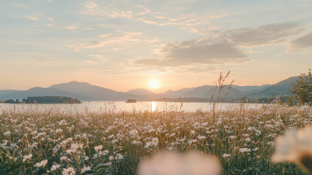 Serene landscape view of a field of white wildflowers at sunset, with a lake and mountains in the background. The image is filled with warm, golden light.