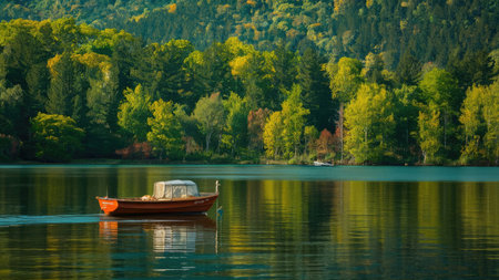 A small orange boat rests on a calm lake surrounded by vibrant autumn foliage. The scene is peaceful and reflective.