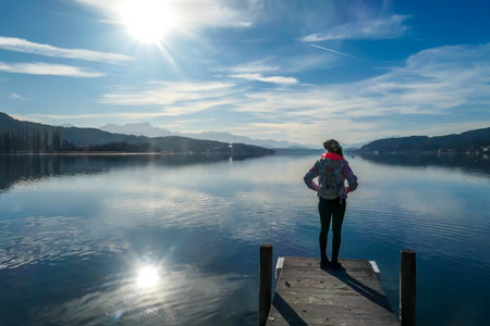Girl wearing a jacket and beanie stands at the end of a promenade on the lake. Soft reflections of the clouds in the lake. Clear but cloudy day. High mountains in the back Calmness and relaxation