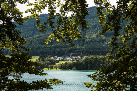 Old houses among the branches, next to a lake and a pine forest. Fuschlsee, Austria
