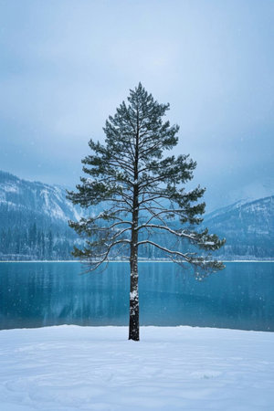 Single pine tree landscape on the lakeside between snow capped mountains