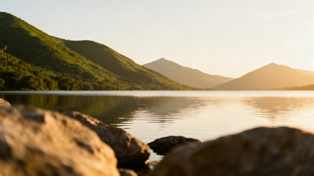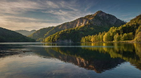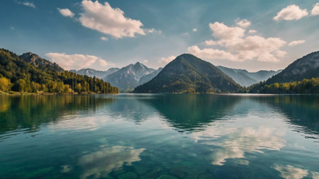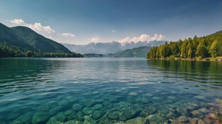 A serene lake surrounded by mountains and lush forests, reflecting the sky and trees.