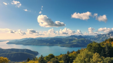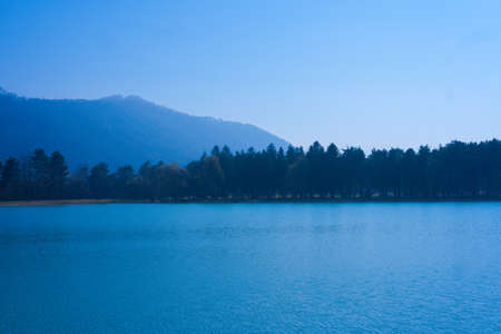 Panoramic view of the lake, mountains and forest in autumn